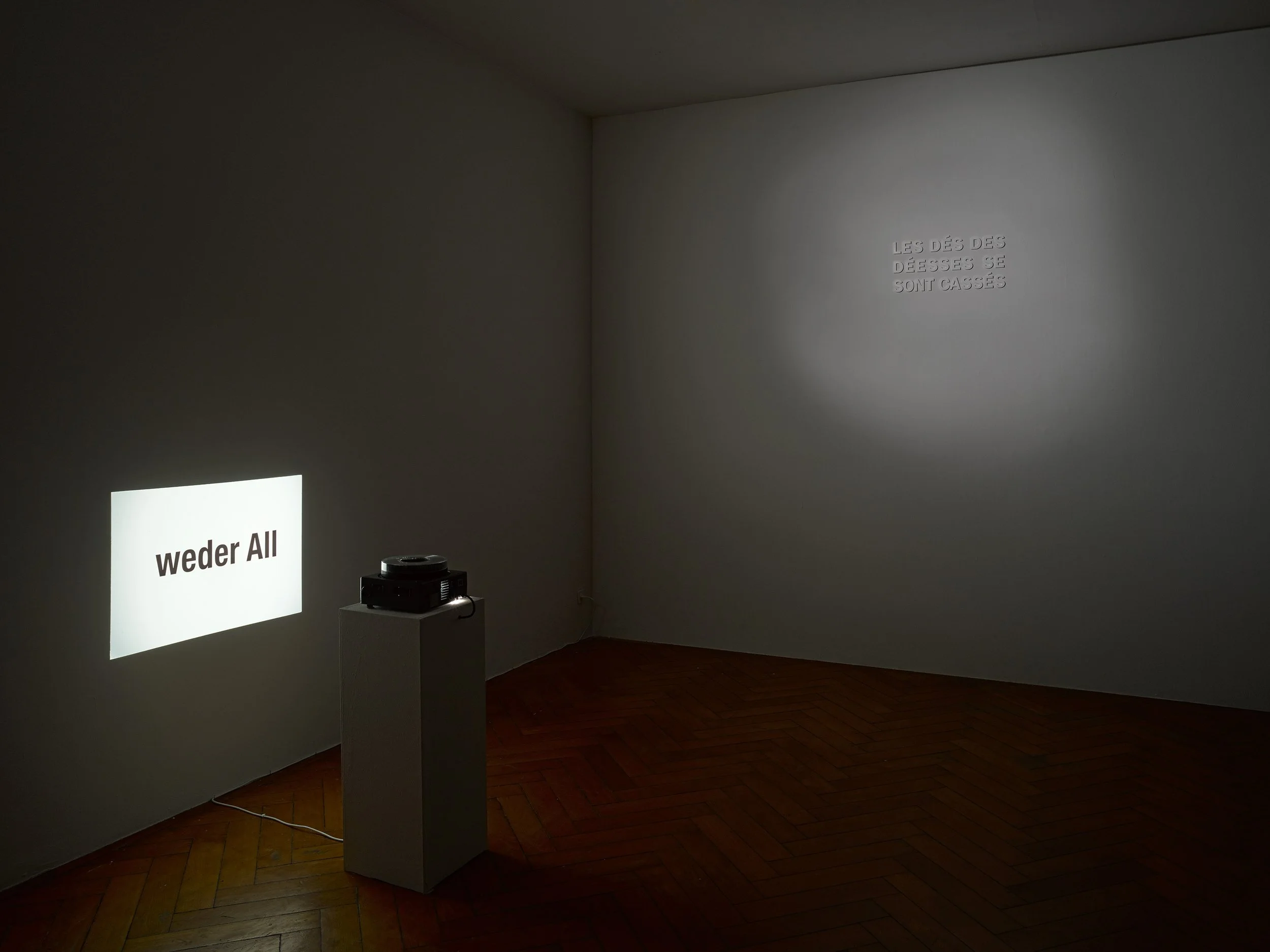 A visual/phonetic language game. The laser-cut letters are attached to the upper part of the wall and lit sparingly by a spot light, turning the installation into a ghost-like, mysterious object. The meaning of the phrase: The dices of the goddesses are damaged.