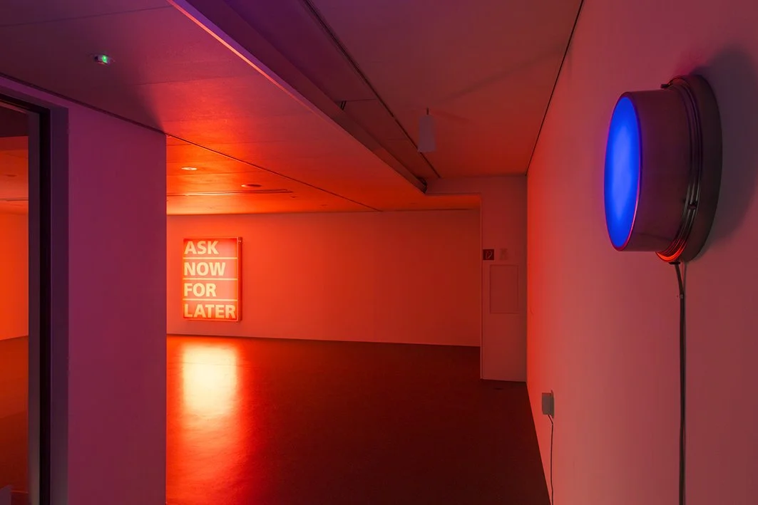 The lightbox casts a dense red onto its surroundings. The words, ASK NOW FOR LATER, form a call to reflect our place in space and time. This is part of a series of slogans with four words each, which dictate both the form and the flow of reading. Each part contains the word FOR.